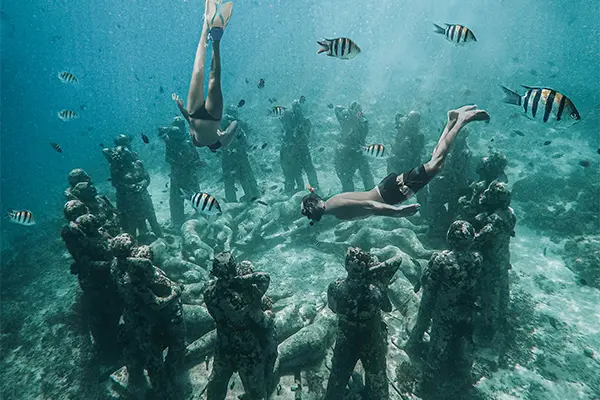 From any of the islands you can book a 3 hours snorkeling trip (with a group or private one), the cost is around 300K IDR for the private one. It includes few beautiful spots. The famous one is Meno Statue, which is just off the shore of Gili Meno Island, it’s called ‘Nest’, and apparently it is made from PH neutral concrete which encourages coral growth and attracts marine life. Absolutely amazing to see, don’t miss it!